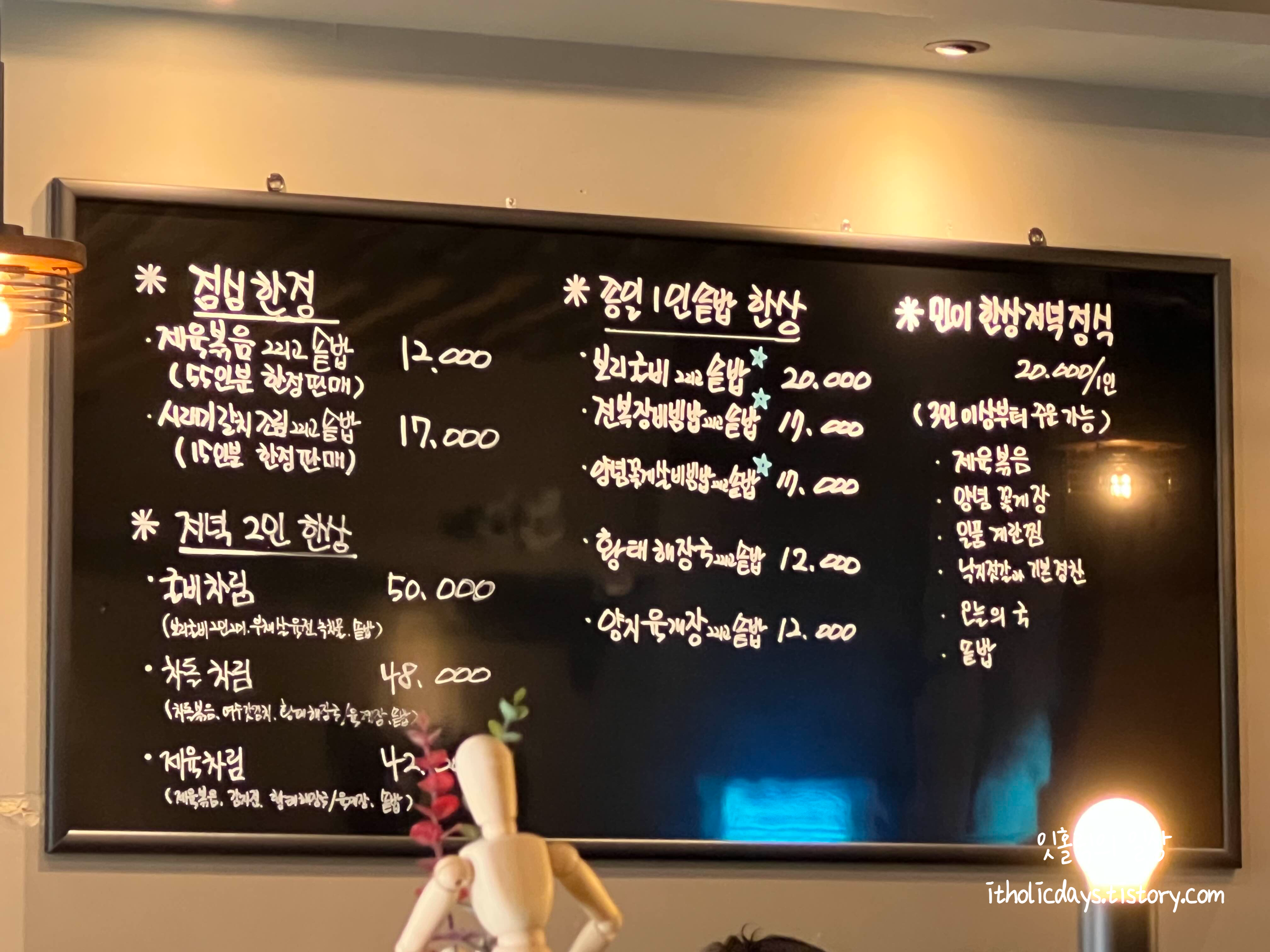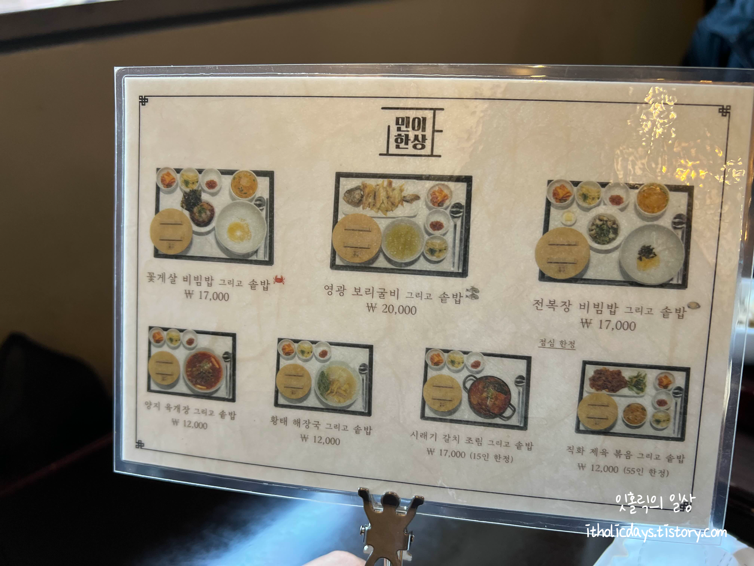 깔끔한 가정식 백반이 먹고 싶어서 역삼에 있는 민이 한상에 다녀왔습니다. 민이한상은 점심한상으로 제육볶음(12,000원), 시래기 갈치조림(17,000원), 하루종일 판매하는 보리굴비(20,000원), 전복장비빔밥(17,000원), 양념꽃게살비빔밥(17,000원), 황태해장국(12,000원) 등등을 판매하고 저녁 한상정식으로 인당 20,000원에 세트메뉴를 팔고 있습니다. 가격이 엄청 저렴한 편은 아닌데 한상 깔끔하고 담백하게 먹을 수 있어서 특별한날 기분좋게 먹을 수 있는 곳이예요.