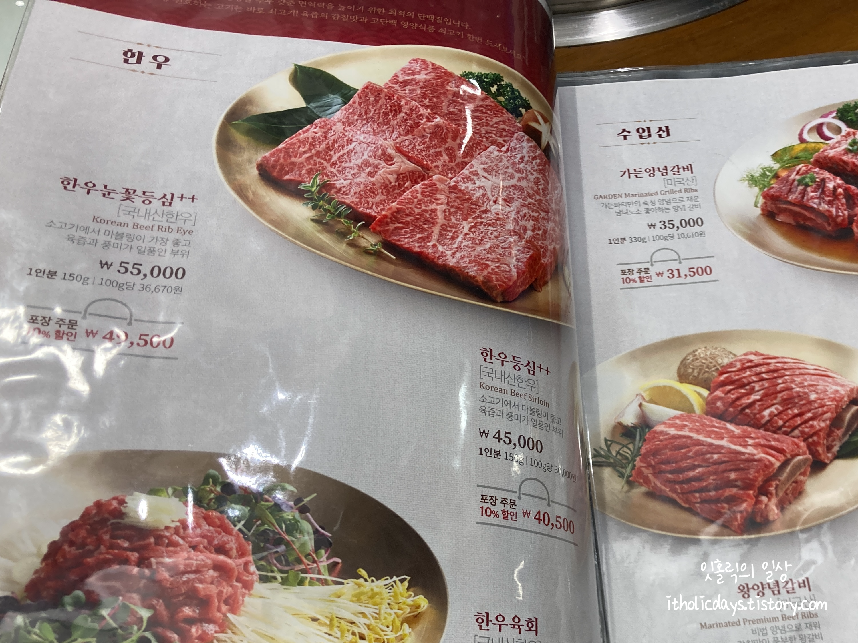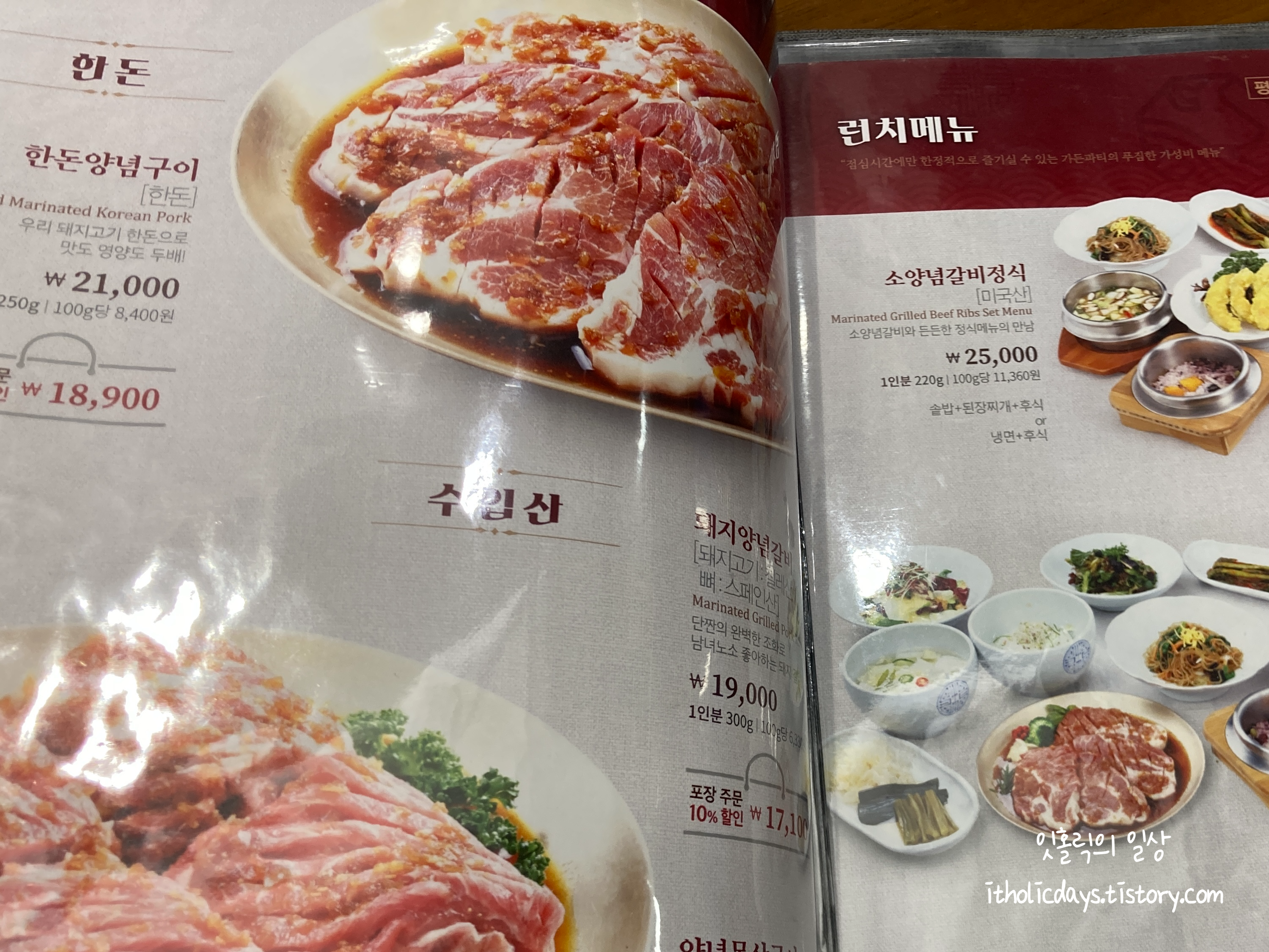 메뉴를 보니 국내산부터 수입산까지 갈비가 다양하게 구비되어 있었습니다. 한우 꽃등심이 55,000원, 한우 육회가 200g에 29,000원, 수입산 양념갈비가 35,000원 수준이었어요. 한돈양념구이도 21,000원에 양념목살구이가 17,000원 이었습니다. 런치 메뉴도 꽤 알차게 나오는 것 같았지만 주말 저녁에 방문해서 런치는 못먹었어요. 대신 돼지고기 양념 목살로 주문했습니다. 가볍게 밥을 먹으러 간거라 소갈비는 손이 안가더라구요. 대신에 기념일이나 가족 생일에 가면 한우로 한끼 맛있게 먹을 수 있을 것 같습니다.
